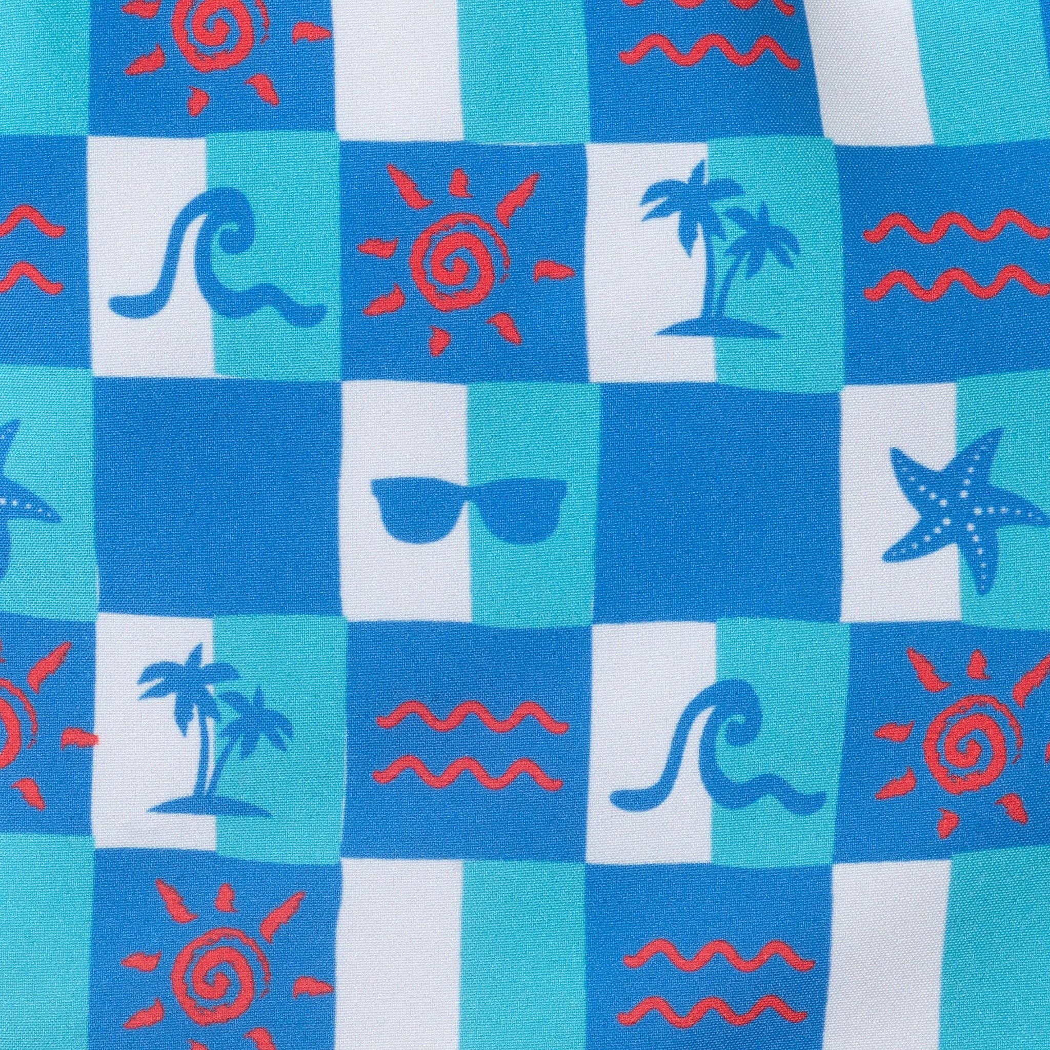 Ready, set, splash! These Boys Checkered Beach Icon Swim Trunks are made for sunny pool days, beach outings, and family vacations. Featuring a bold checkered pattern filled with playful beach icons—waves, palm trees, sunglasses, and more—these swim trunks bring fun, color, and personality to every water day. Designed for toddlers and kids who love to move, these lightweight swim trunks offer an easy pull-on fit, quick-dry comfort, and built-in UPF 50+ sun protection. From big cannonballs to sandy snack breaks, they’re ready for nonstop summer swim fun. * Checkered Beach Icon Print: A playful mix of seaside symbols that adds bold style to pool and beach days * UPF 50+ Sun Protection: Fabric recommended by the Skin Cancer Foundation to protect against harmful UV rays * Elastic Waistband with Adjustable Drawstring: Provides a secure, comfortable fit for active kids * Lightweight, Quick-Dry Fabric: Keeps kids comfortable in and out of the water * Made for Movement: Designed for swimming, splashing, and