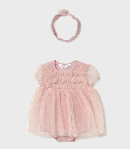 Mayoral Newborn Tulle Romper with Headband- Baby Pink