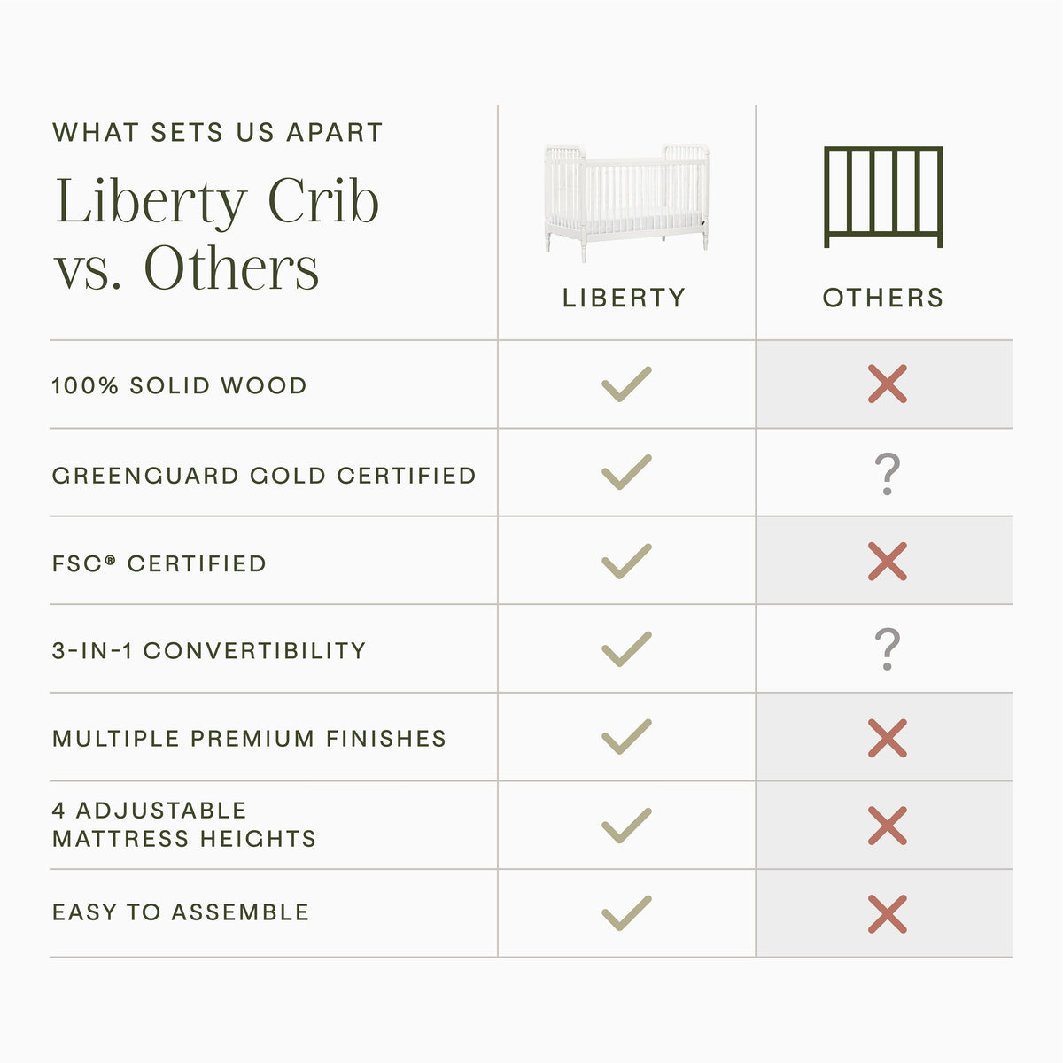 Liberty's fresh take on the antique spindle crib brings vintage elegance to the nursery. The classic silhouette is made bolder with a sturdy frame and thicker spindles. The versatile Liberty crib is the perfect centerpiece in any nursery.