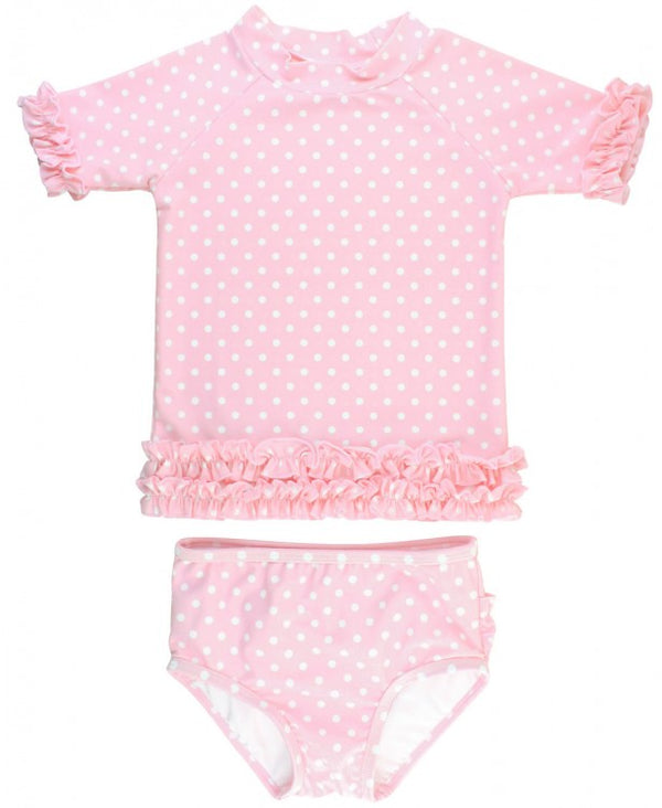 RuffleButts Pink Polka Dot Ruffled Rash Guard Bikini