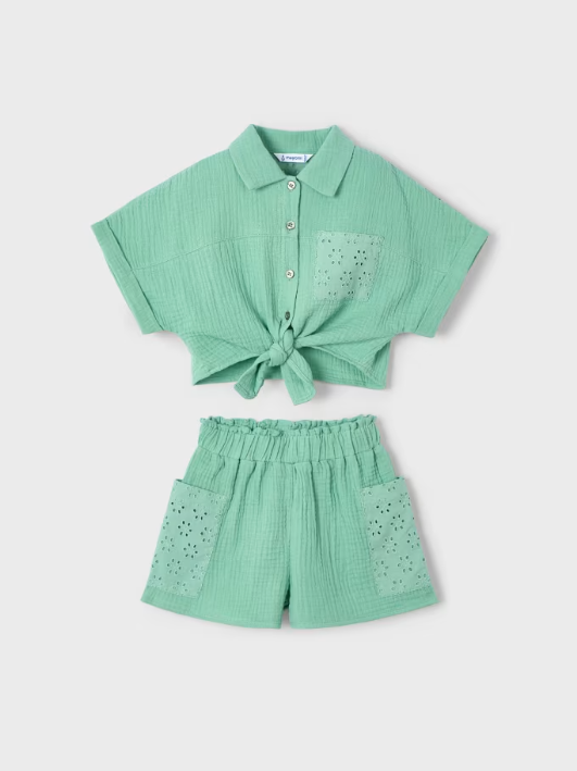 Mayoral Girl Eyelet Shorts and Blouse Set- Mint