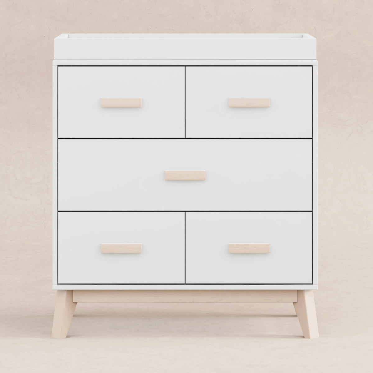 The Scoot 3-drawer Changer Dresser is the definition of mid-century modern style. The perfect accompaniment to your Scoot 3-in-1 Crib with matching tapered feet and two-toned or solid color detailing. With three smooth-glide drawers and an included removable changing tray, this compact unit provides a range of practical storage possibilities to suit all of your nursery needs.