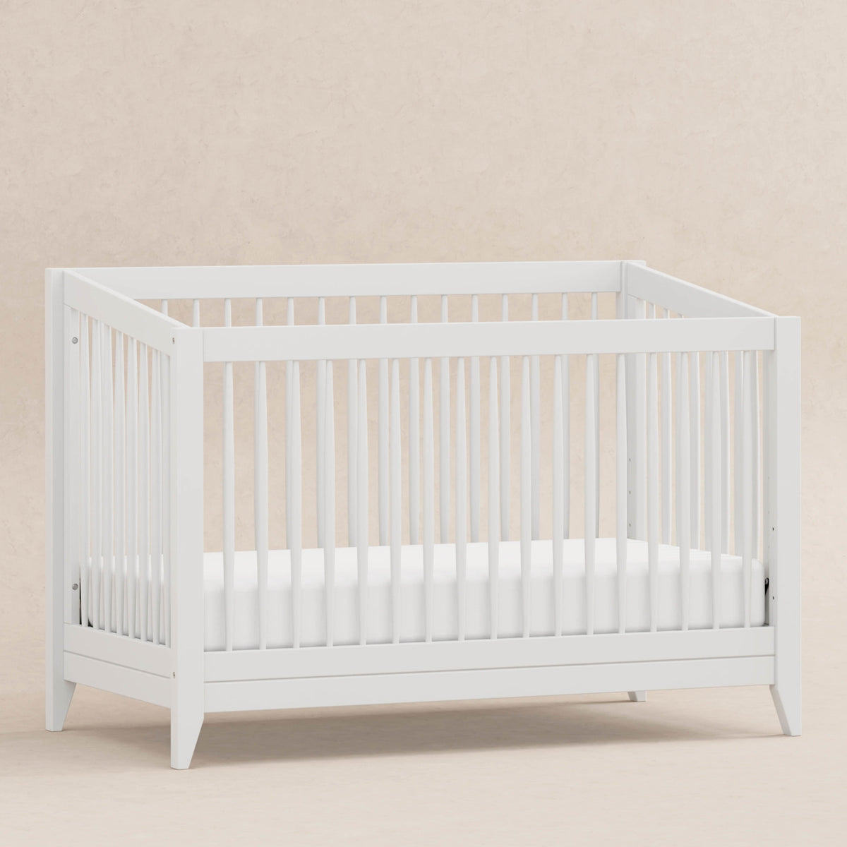 Add new dimension and geometric playfulness to your modern nursery with the Sprout 4-in-1 Convertible Crib. Tapered spindles and triangular feet bring nostalgic charm to this crib’s modern shape. And with a subtle raised back, Sprout can grow with your babe with a smart full-size bed conversion. Made with sustainable pine wood and GREENGUARD Gold certified to improve indoor air quality.