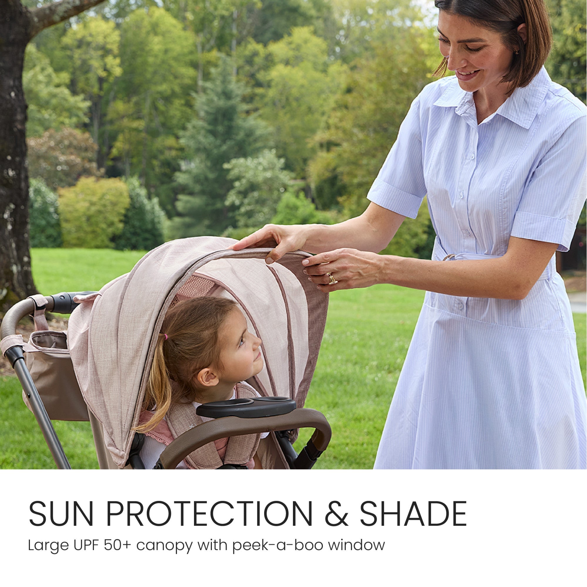 - SUN PROTECTION & SHADE: Help protect your tiny passenger from the sun and rain with the ventilated, water-resistant, and UPF 50+ expandable canopy and sun visor. Easily check in through the peek-a-boo window during strolls.
