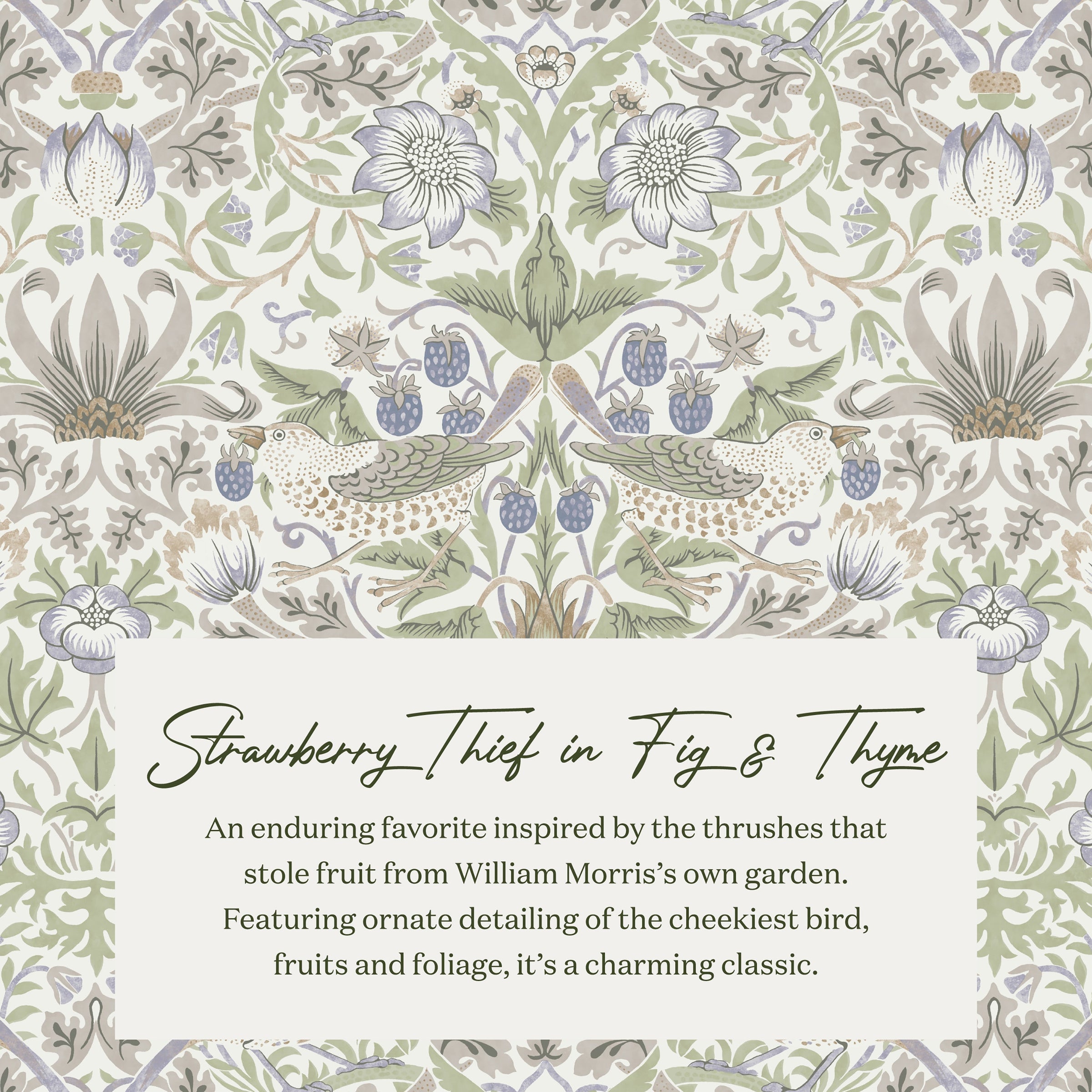 - ABOUT THE DESIGN: An enduring favorite at Morris & Co., this enchanting design was inspired by the thrushes that stole fruit from William Morris's own garden. Featuring ornate detailing of the cheekiest bird, fruits and foliage, it's a charming classic.